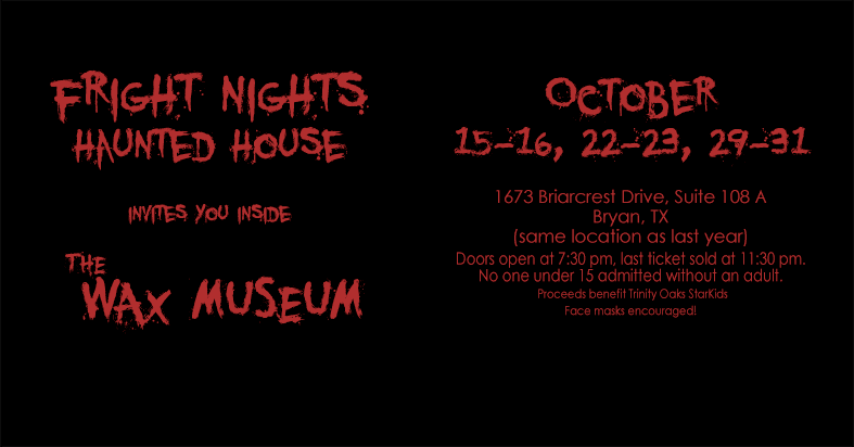 Fright Nights Haunted House BCS Invites You Inside The Wax Museum! Don’t miss the final weekend of Fright Nights Haunted House!