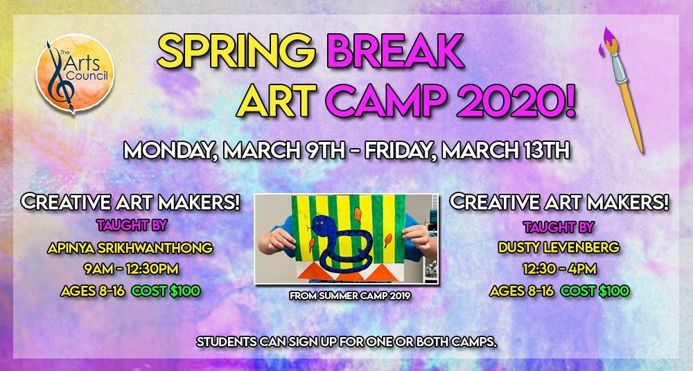 Let your child explore their creative side and discover new hobbies during The Arts Council’s first ever Spring Break Art Camp. From March 9th through the 13th, your child will learn new techniques, tricks of the trade, and enjoy creating their own master pieces! Creative Art Makers will have two sessions each day.