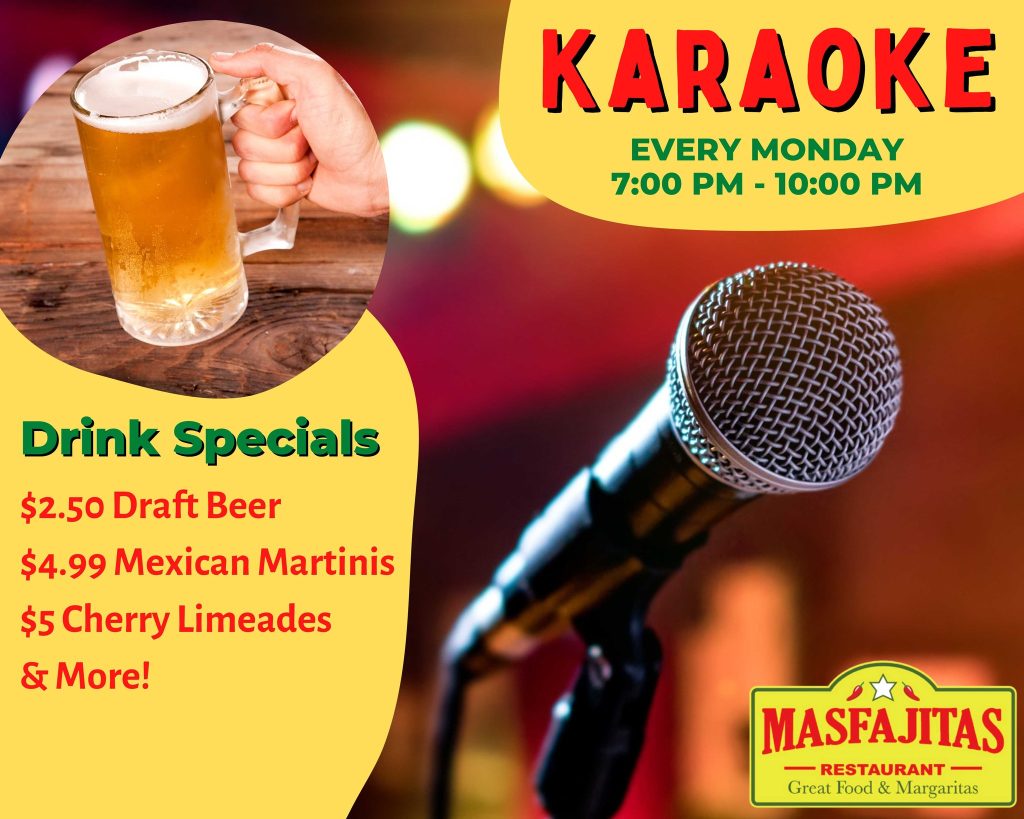 Masfajitas is introducing live karaoke with DJ Marco every Monday from 7-10pm. Please join us for a great food and drink specials!!!