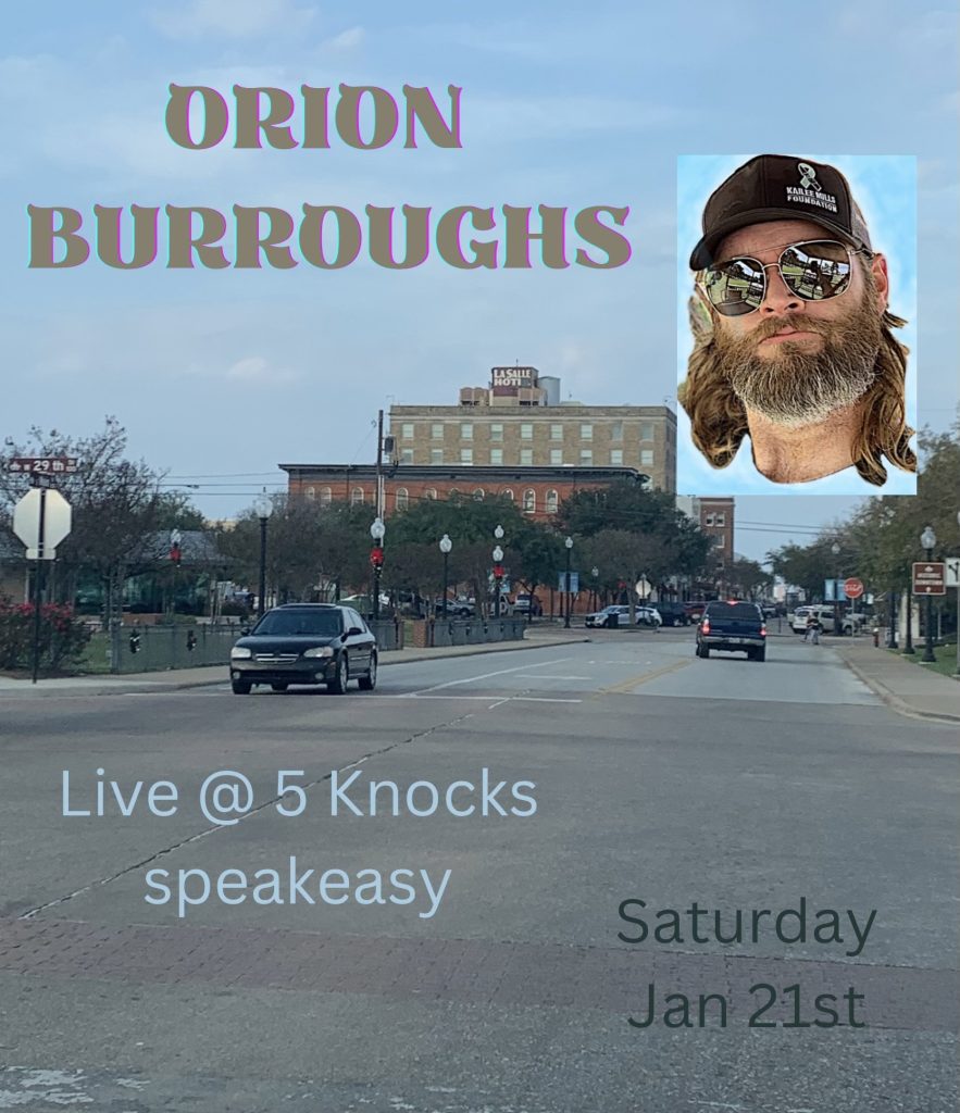 Y’all come on out to 5 Knocks Speakeasy located in the basement of the Lasalle Hotel in downtown Bryan, and enjoy some amazing craft cocktails, beer, wine, and live music by Orion Burroughs.