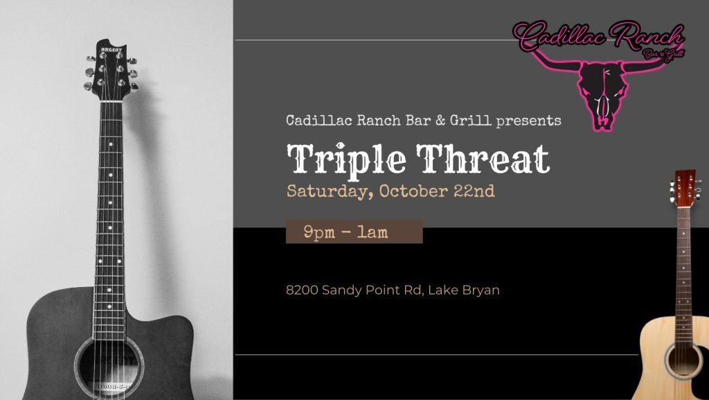 15oct8:00 pmTriple Threat LIVE @ Cadillac Ranch Bar & Grillat Lake Bryan