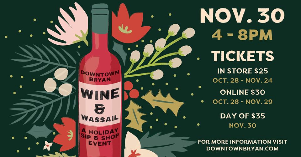 Downtown Bryan is hosting its annual Wine & Wassail holiday sip & shop event on Saturday, November 30, 2019 from 4-8 p.m. During this time of year, Downtown Bryan is
